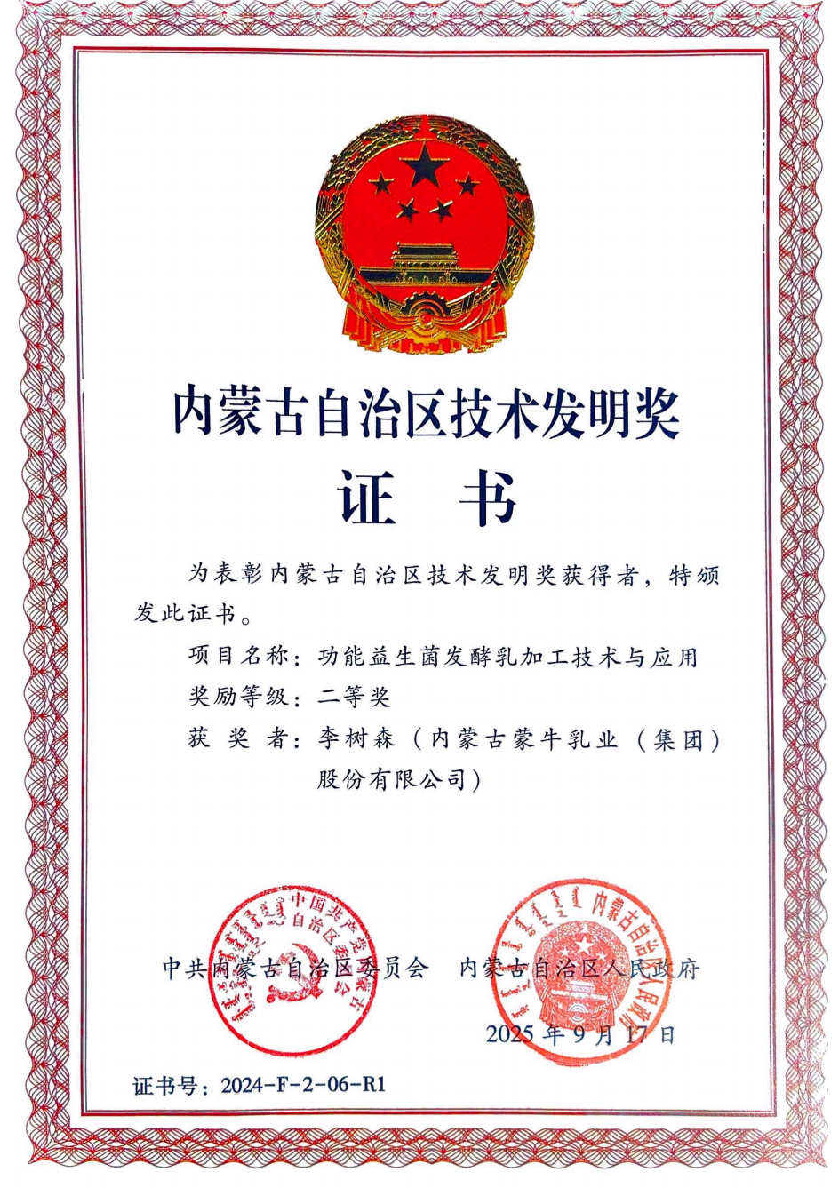 近日,内蒙古自治区科学技术奖励大会在呼和浩特召开,会上表彰了为全区科技进步和高质量发展作出突出贡献的科技工作者、科研团队。蒙牛集团两项科研成果凭借在行业技术创新和产业化应用中的突出贡献,荣获自治区科技进步和技术发明二等奖。
