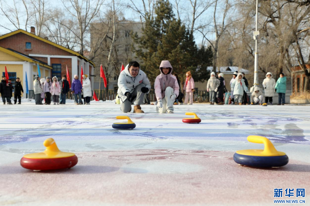 12月18日,在内蒙古自治区呼伦贝尔市扎兰屯市实验小学滑冰场,学生们在“冰雪课堂”学习掷冰壶。新华网发(韩颖群 摄)