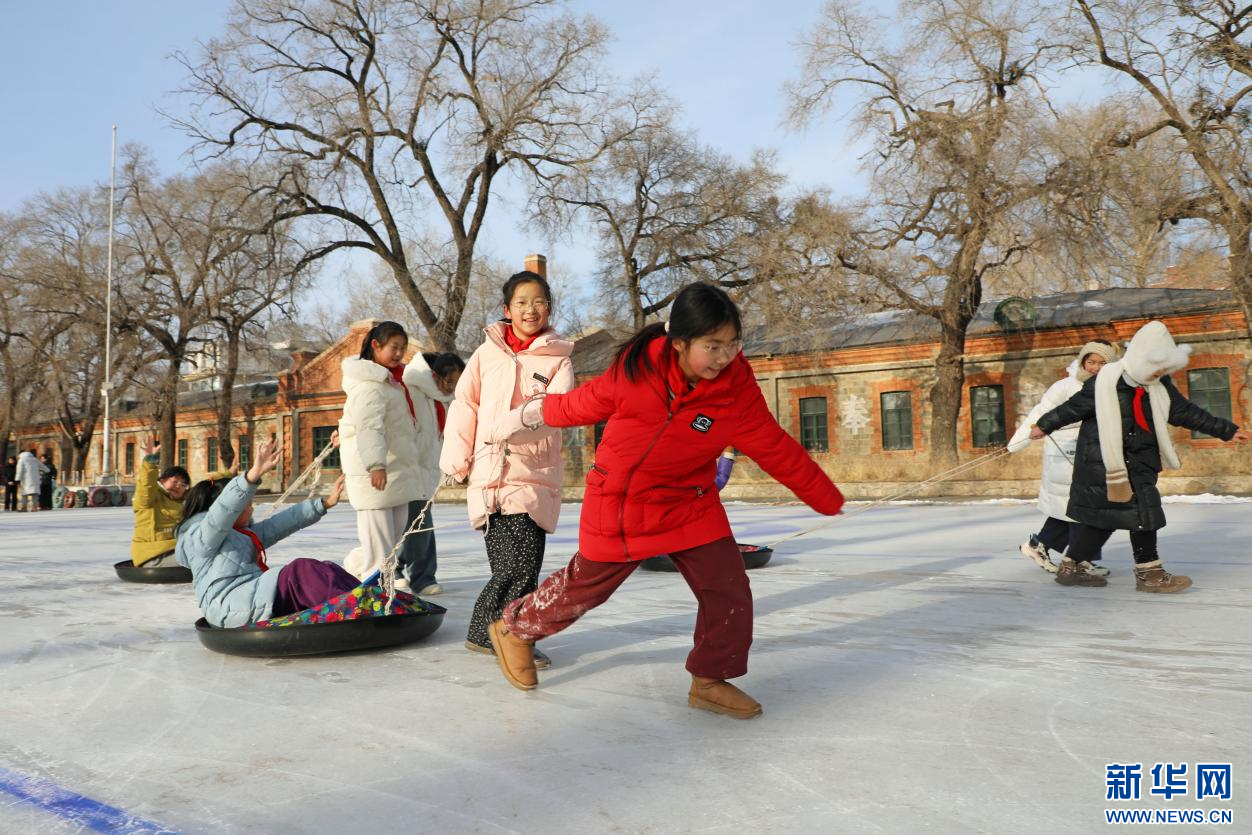 12月18日,在内蒙古自治区呼伦贝尔市扎兰屯市实验小学冰场,学生们在“冰雪课堂”进行拉雪圈比赛。新华网发(韩颖群 摄)