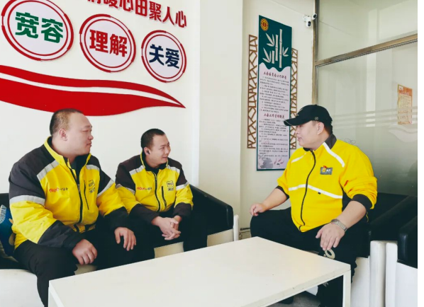呼伦贝尔市牙克石市美团外卖配送员王永波(右一)与配送员谈心谈话。
