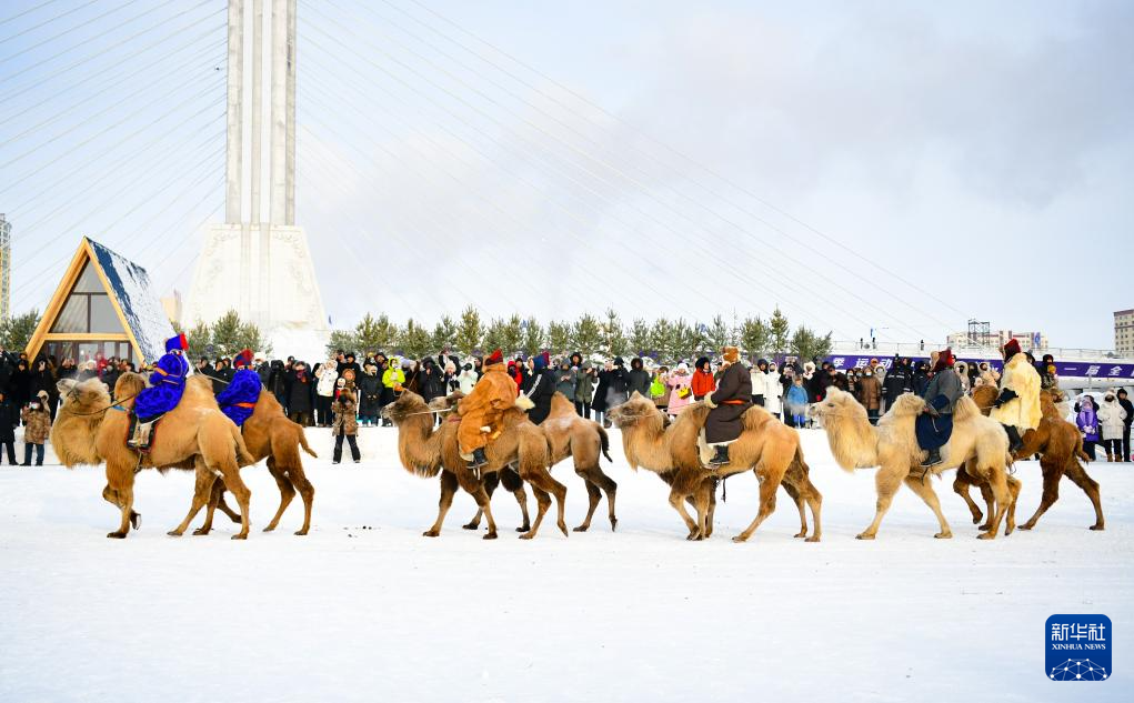 12月20日,参加开幕式彩排的驼队入场。