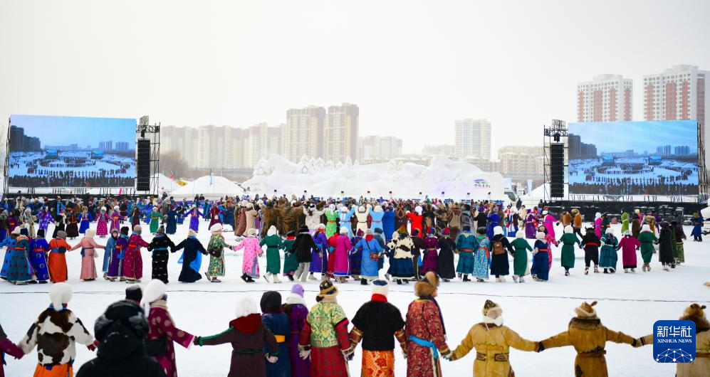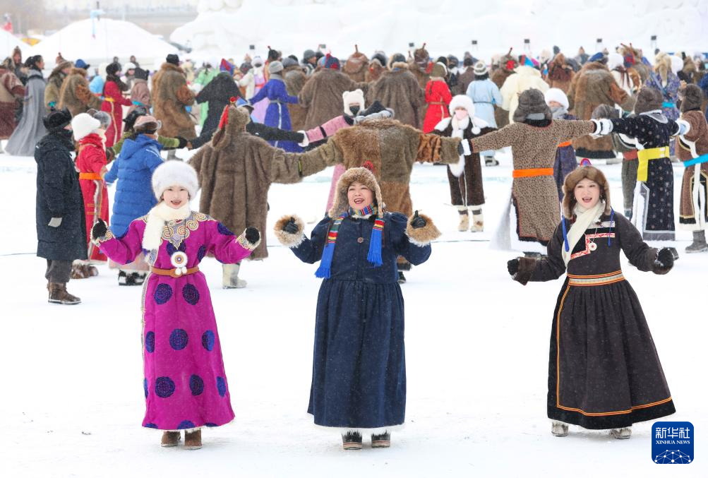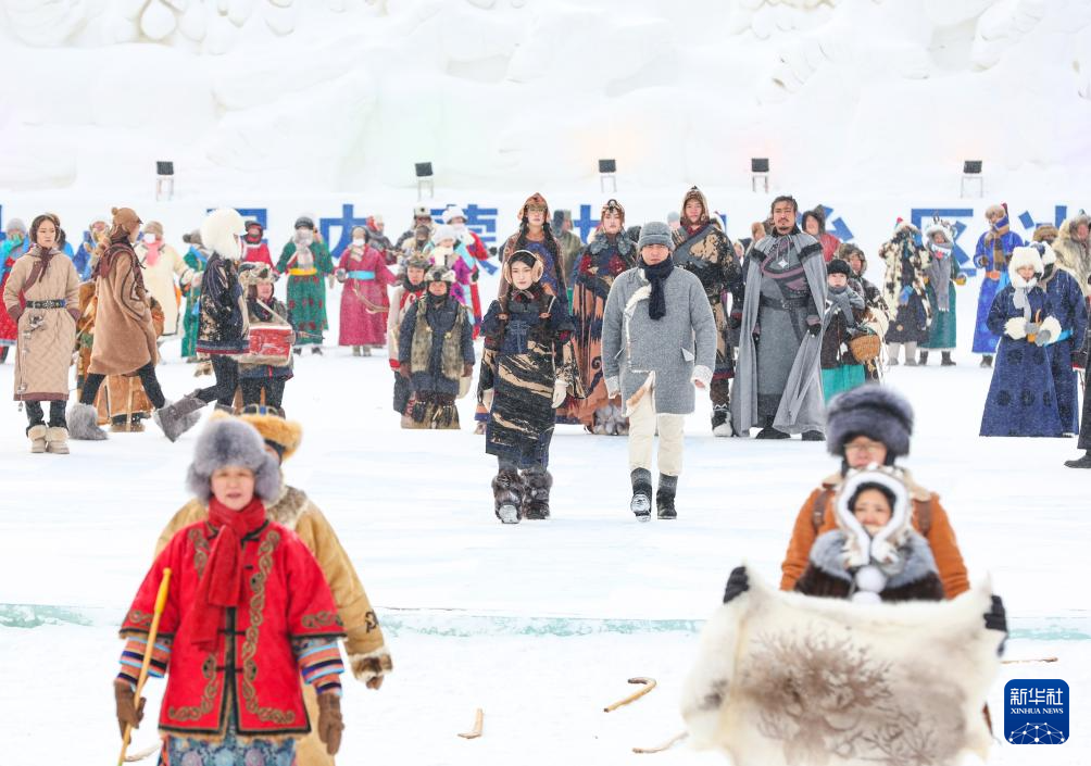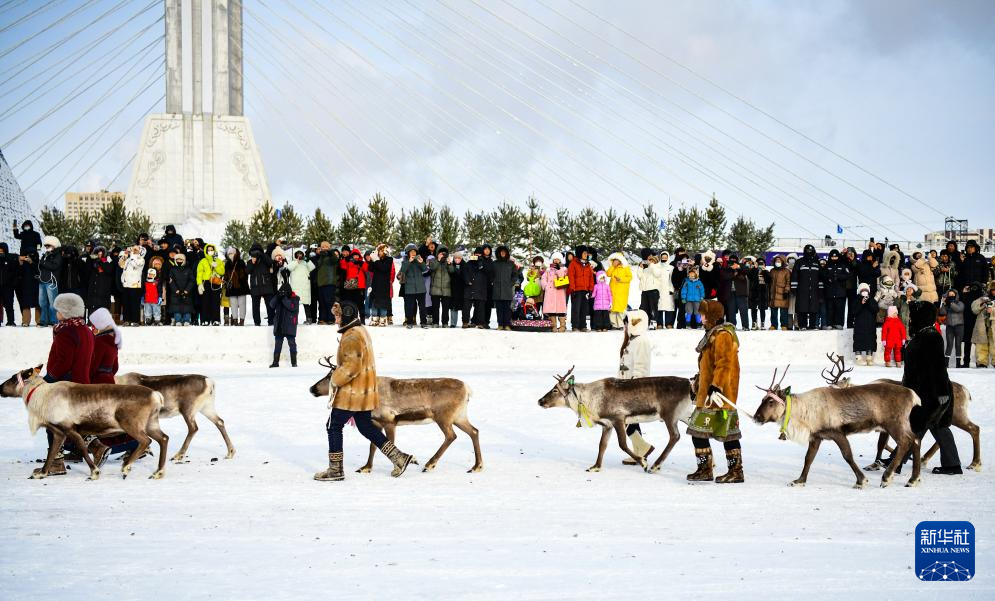 12月20日,参加开幕式彩排的敖鲁古雅鄂温克牧民带领驯鹿入场。