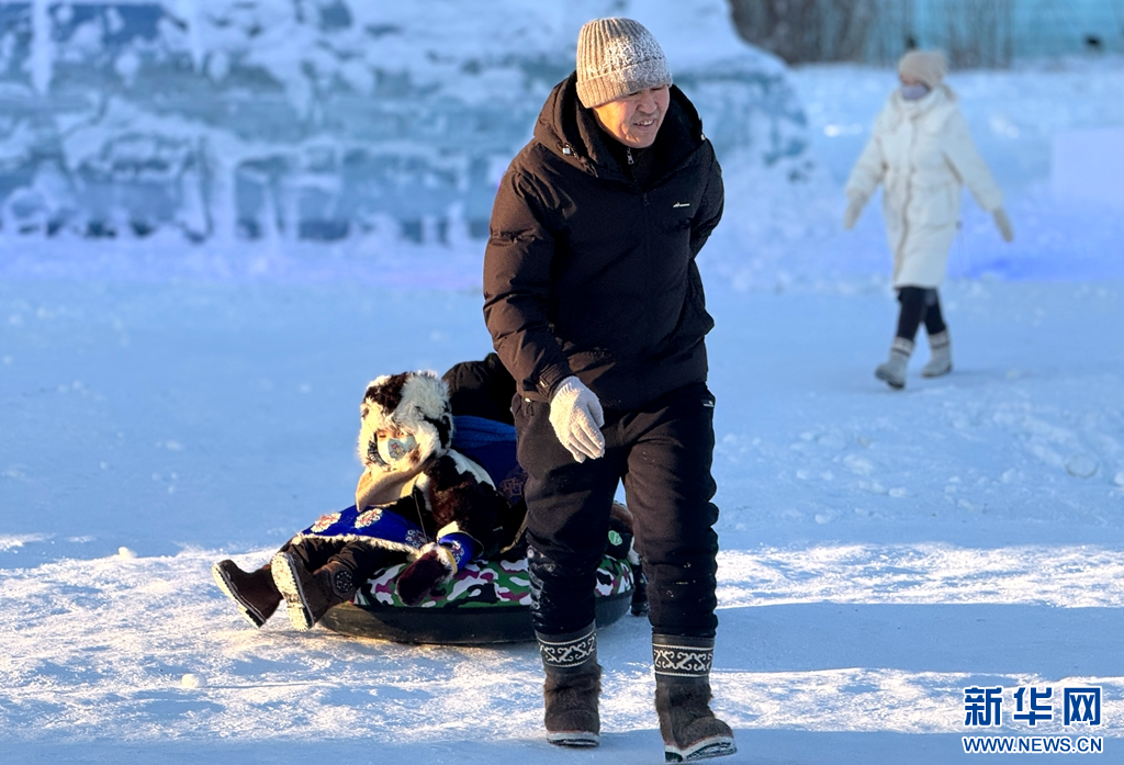 12月20日,市民、游客在呼伦贝尔绒绒雪世界冰滑梯游玩。新华网 李倩摄