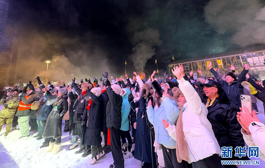 12月21日,市民、游客在内蒙古冰雪英雄会开幕式演绎环节与歌手互动。新华网 李倩摄