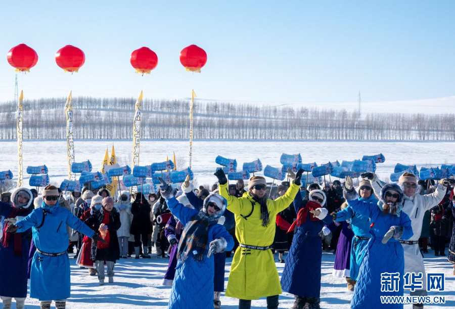 12月23日,内蒙古冰雪英雄会额尔古纳站开赛现场,身着盛装的当地民众欢迎远方来客。新华网发(吕昊俊 摄)