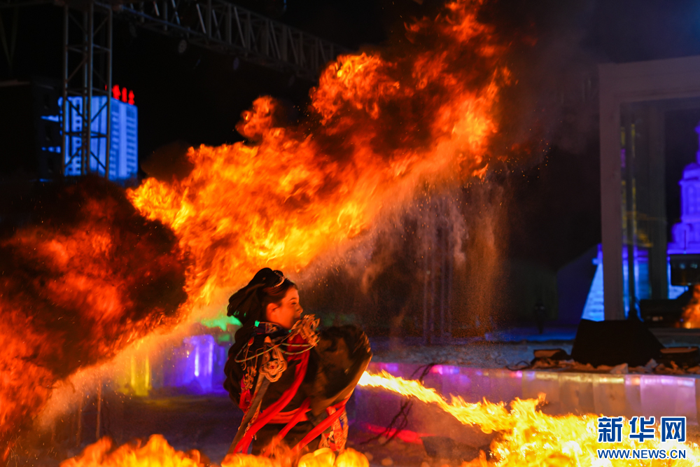 12月20日,艺人在“绒绒雪世界”表演火焰特技。新华网发(张健 摄)
