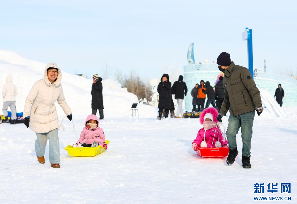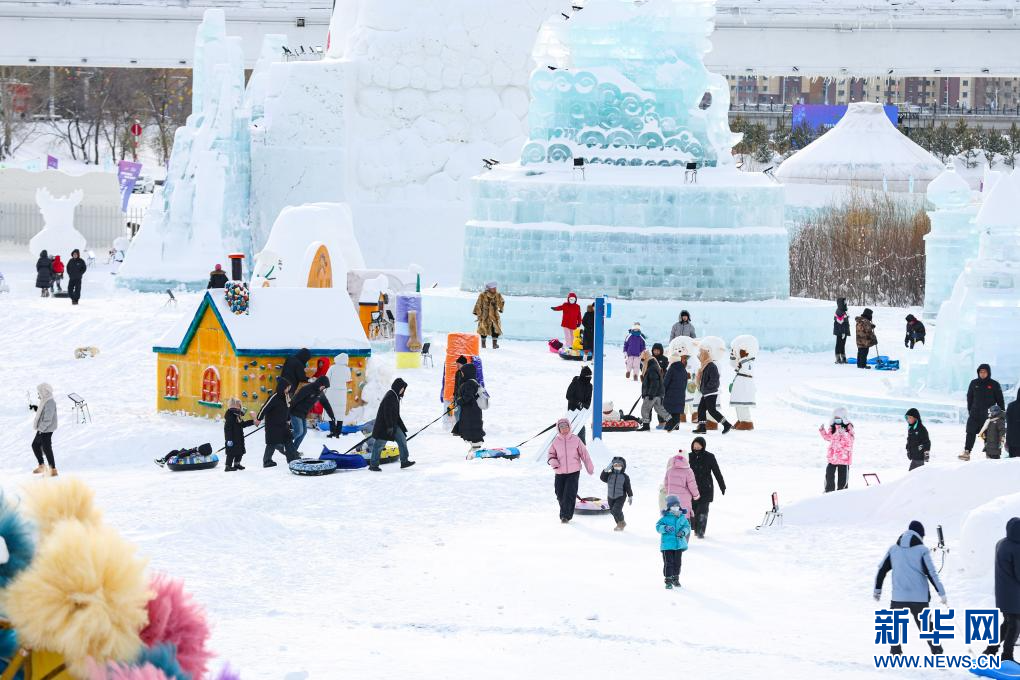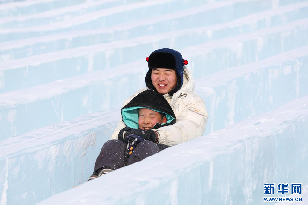 12月20日,游客在“绒绒雪世界”体验冰滑梯。新华网发(康文魁 摄)
