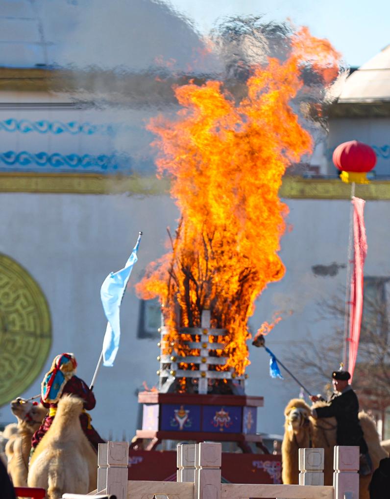 12月27日,阿拉善盟盟委副书记、盟长白海林(右)引燃火炬。(康文魁 摄)