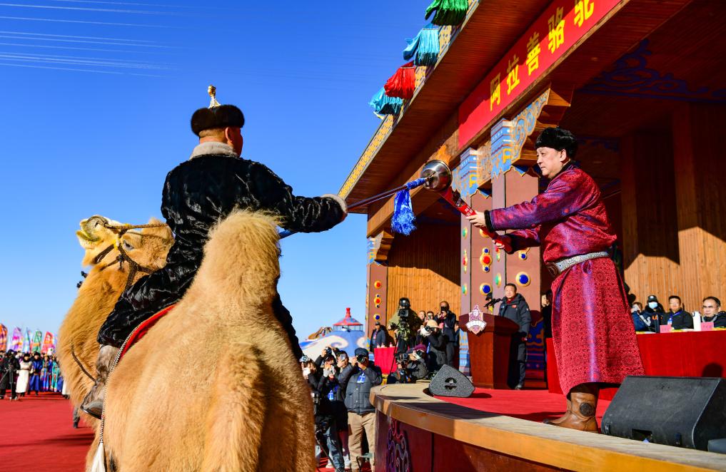 这是12月27日拍摄的阿拉善骆驼超级联赛开幕式现场。