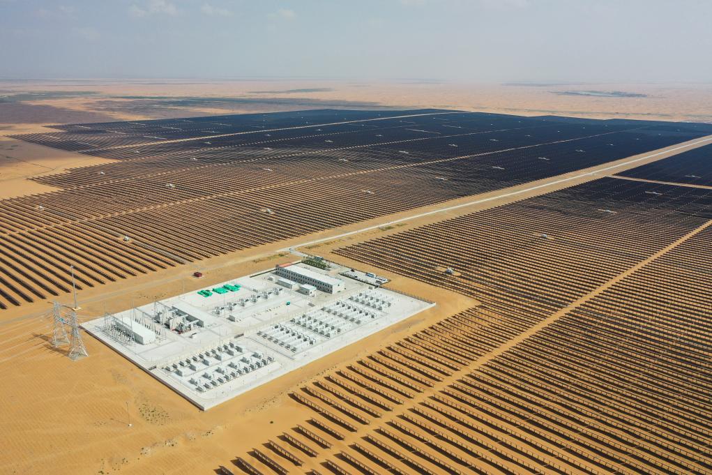 内蒙古华电腾格里“沙戈荒”新能源基地位于内蒙古阿拉善盟阿拉善左旗腾格里沙漠边缘。“沙戈荒”是沙漠、戈壁、荒漠的统称,这里虽然寸草难生,却普遍具有丰富的光照资源。阿拉善盟依托“沙戈荒”里丰富的光照资源,探索“光伏发电+防沙治沙”模式,深入实施防沙治沙和风电光伏一体化工程,阻止腾格里沙漠东侵南移,推动能源开发利用与生态环境协调发展。