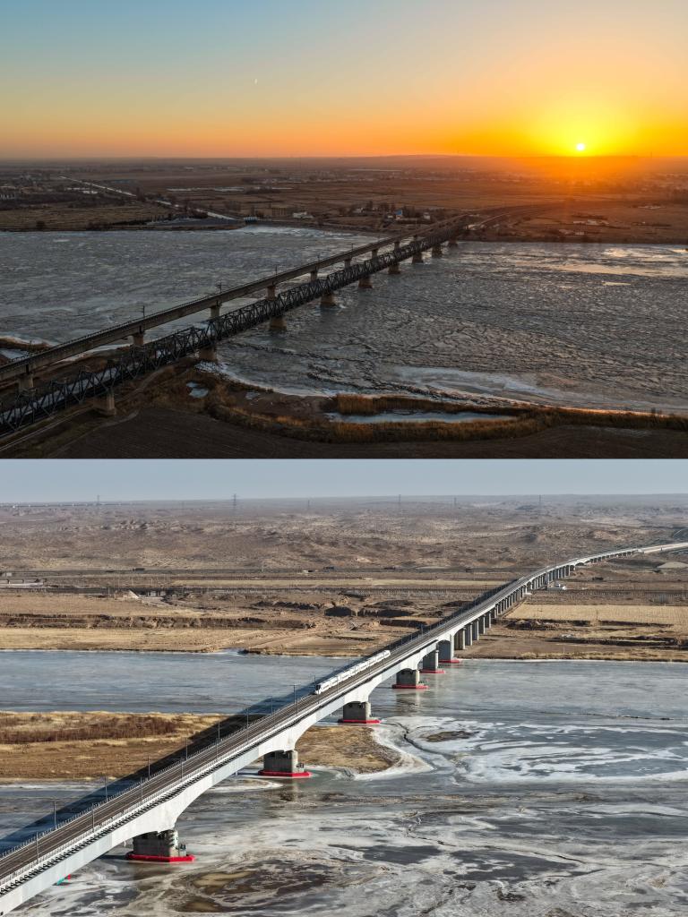 这是一张拼版照片:上图为2月11日拍摄的包兰铁路三盛公黄河铁路特大桥(无人机照片);下图为2月10日拍摄的包银高铁磴口黄河特大桥(无人机照片)。新华社记者 李志鹏 摄