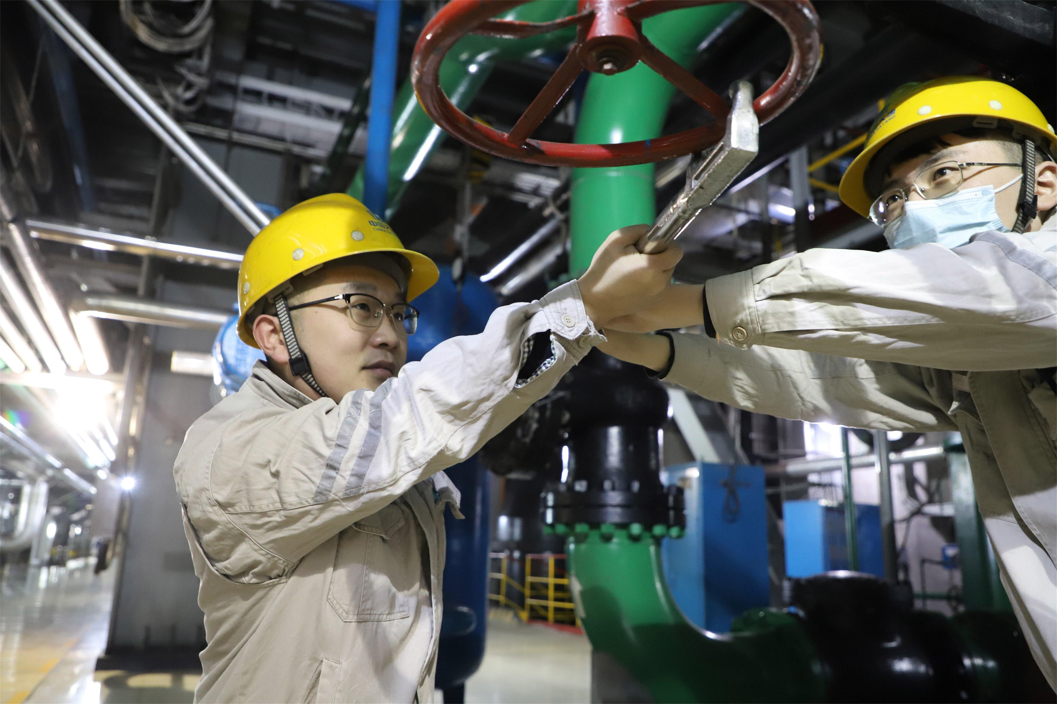内蒙古大唐国际托克托发电有限责任公司发电部集控运行值班员刘成成(左一)在进行就地操作,确保机组稳定运行