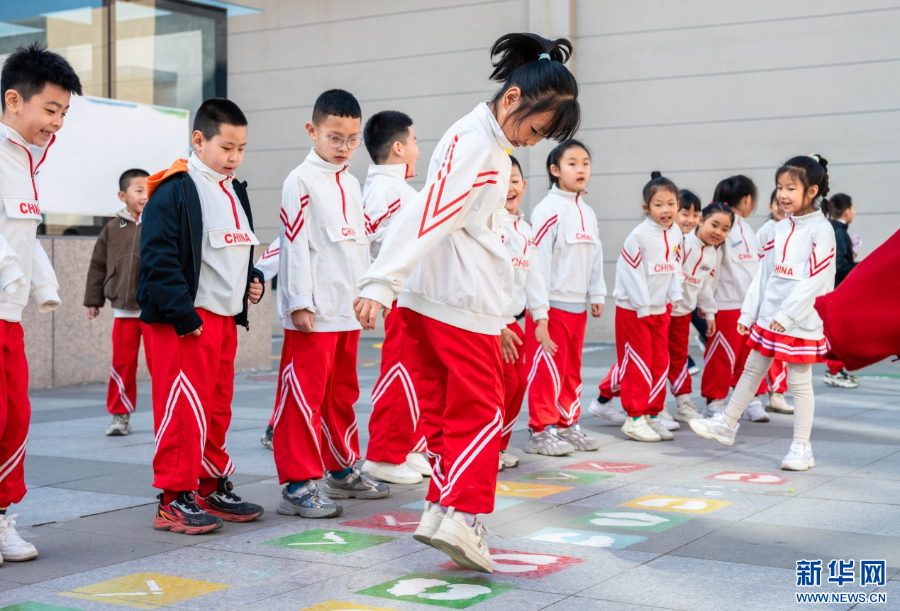 3月25日,呼和浩特市南马路小学新华西街校区学生在15分钟课间玩跳方格游戏。新华网发(丁根厚 摄)