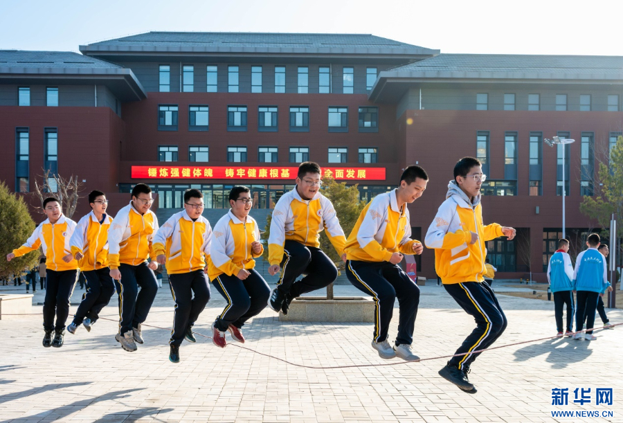 3月25日,中央民族大学附属中学呼和浩特分校学生在课间玩跳长绳。新华网发(丁根厚 摄)