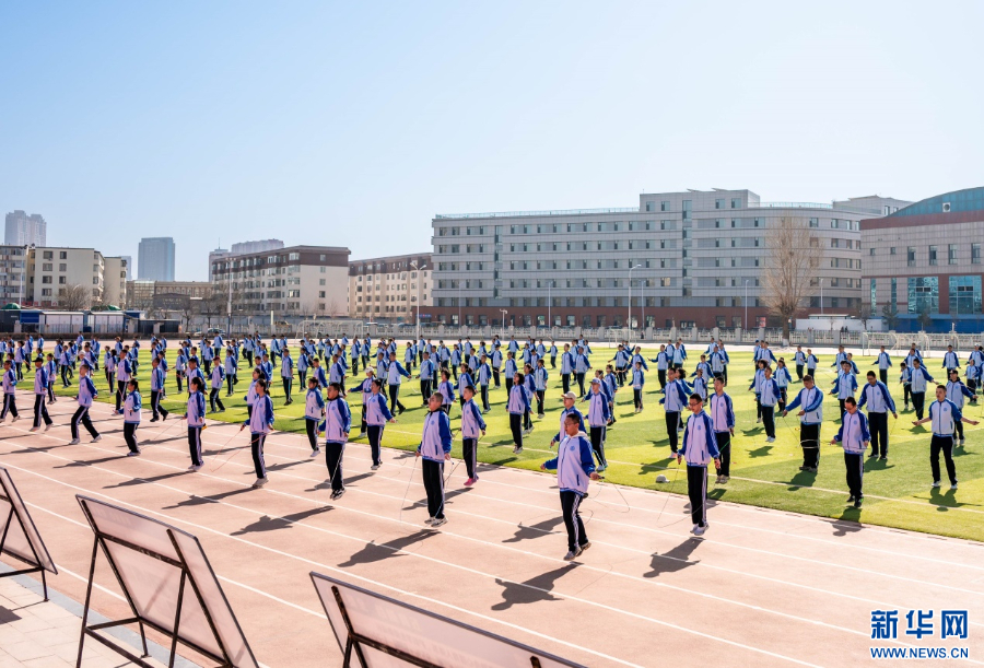3月25日,呼和浩特市南马路小学新华西街校区的师生在15分钟课间玩跳长绳。新华网发(丁根厚 摄)