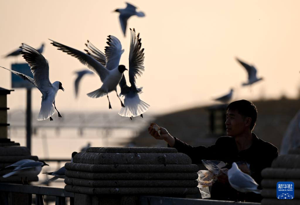 近日,随着天气转暖,大批红嘴鸥来到内蒙古乌海市乌海湖觅食嬉戏,与沙漠、湖泊、城市构成了独特的春日景观,吸引众多游人到湖边打卡观景。