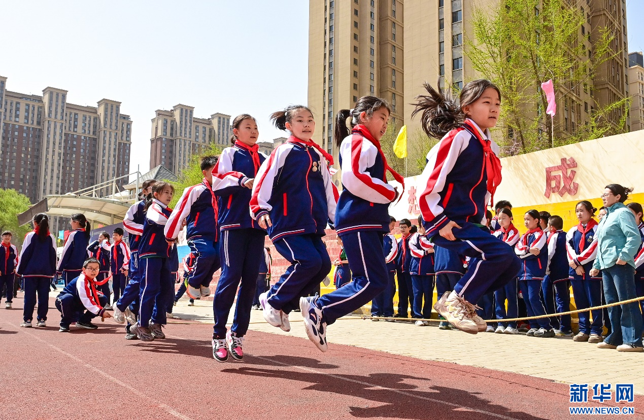 4月17日,呼和浩特市赛罕区腾飞路小学学生在大课间参加跳绳运动。新华网发(王正 摄)