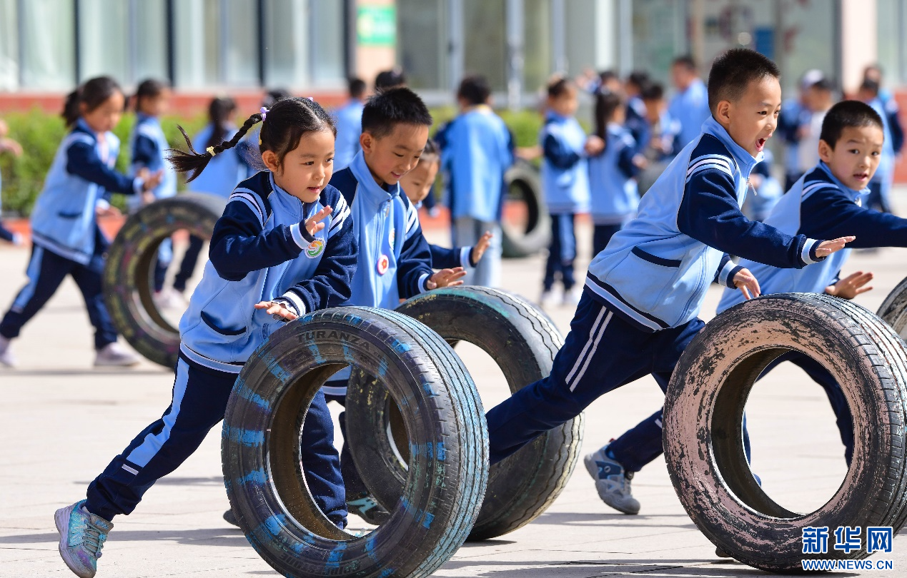 4月17日,呼和浩特市赛罕区腾飞路小学学生在大课间参加滚轮胎运动。新华网发(王正 摄)