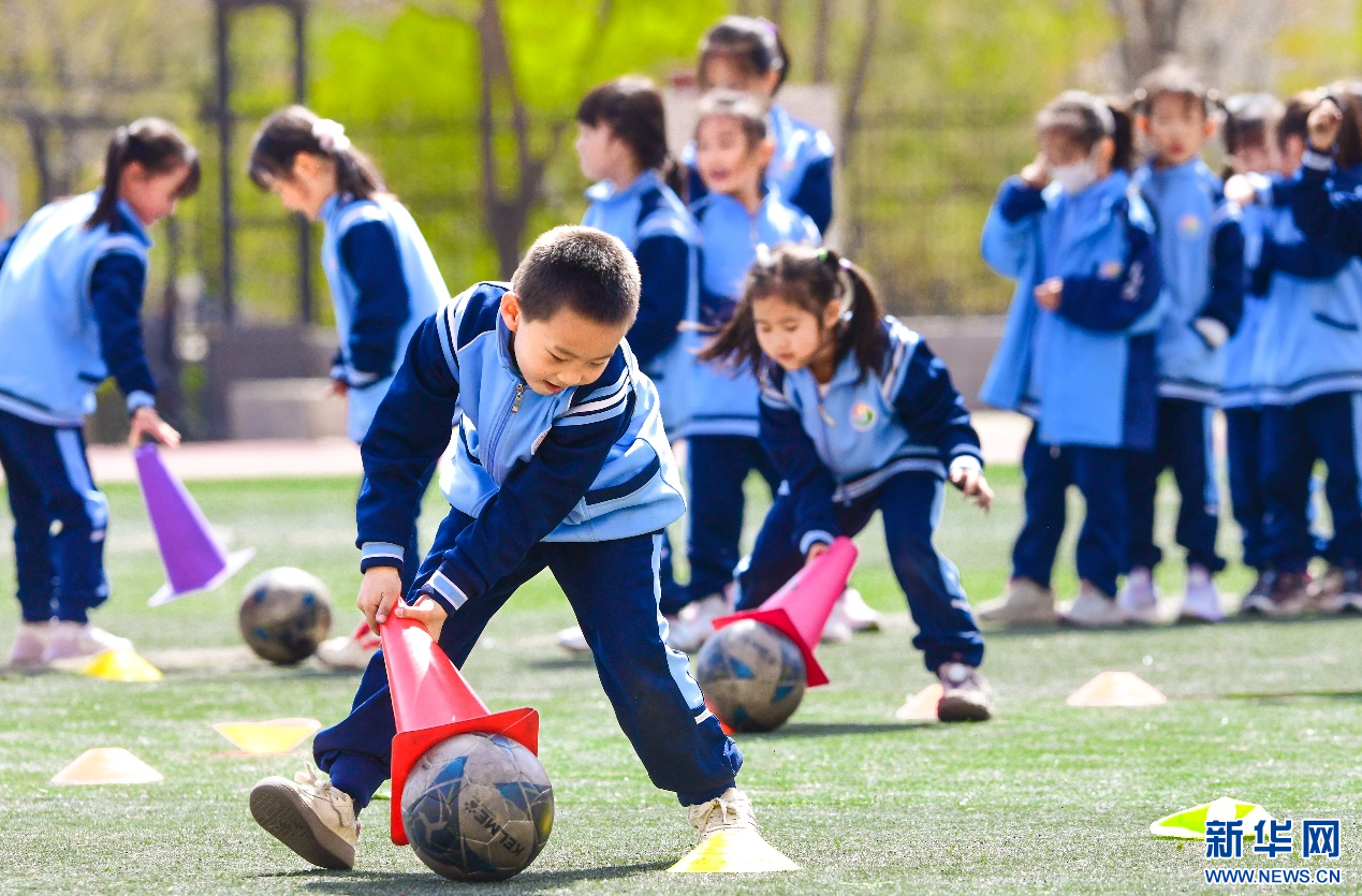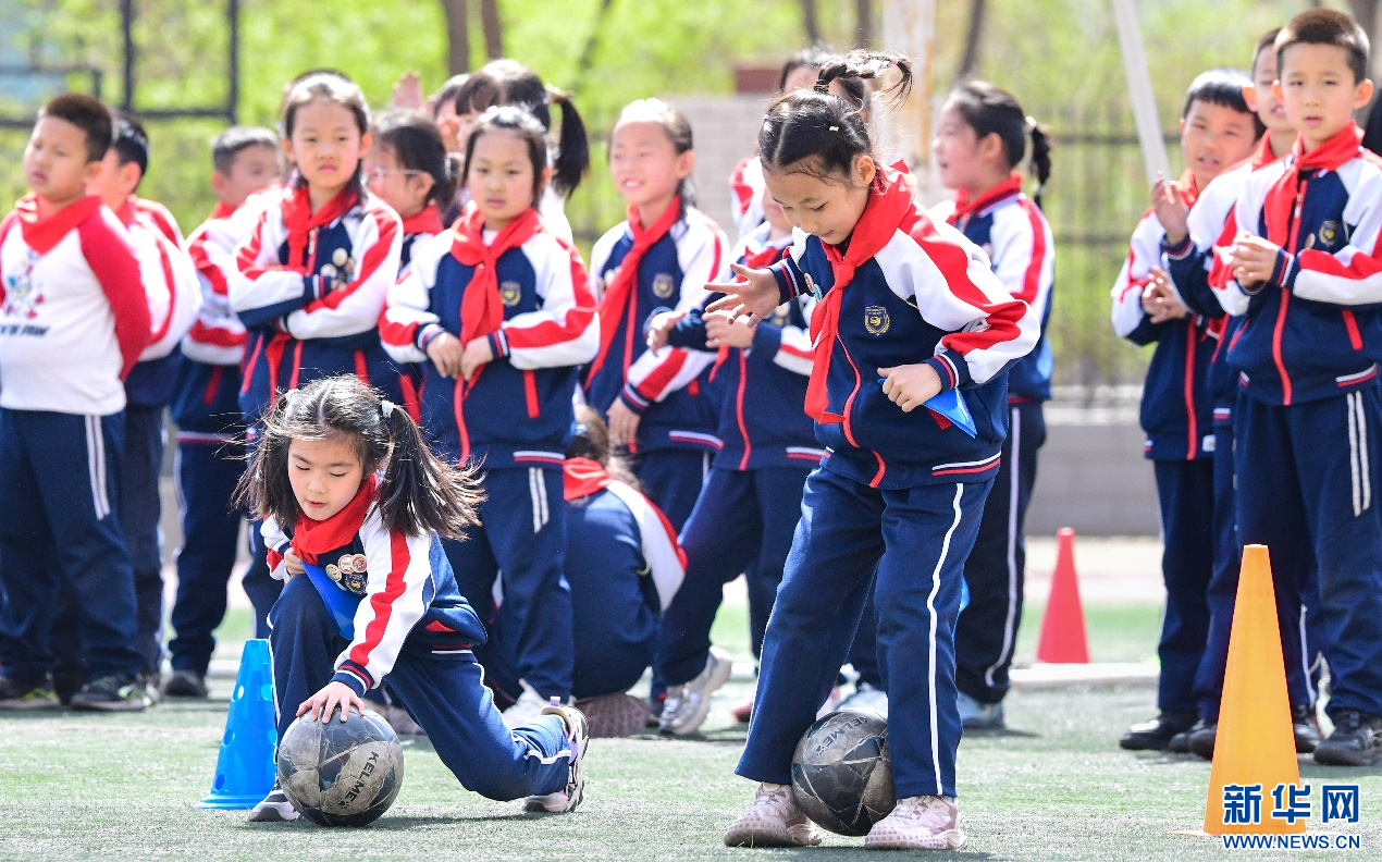 4月17日,呼和浩特市赛罕区腾飞路小学学生在大课间参加趣味足球运动。新华网发(王正 摄)