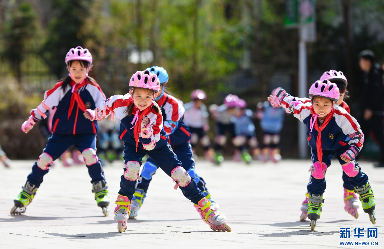 4月17日,呼和浩特市赛罕区腾飞路小学学生在大课间参加轮滑运动。新华网发(王正 摄)