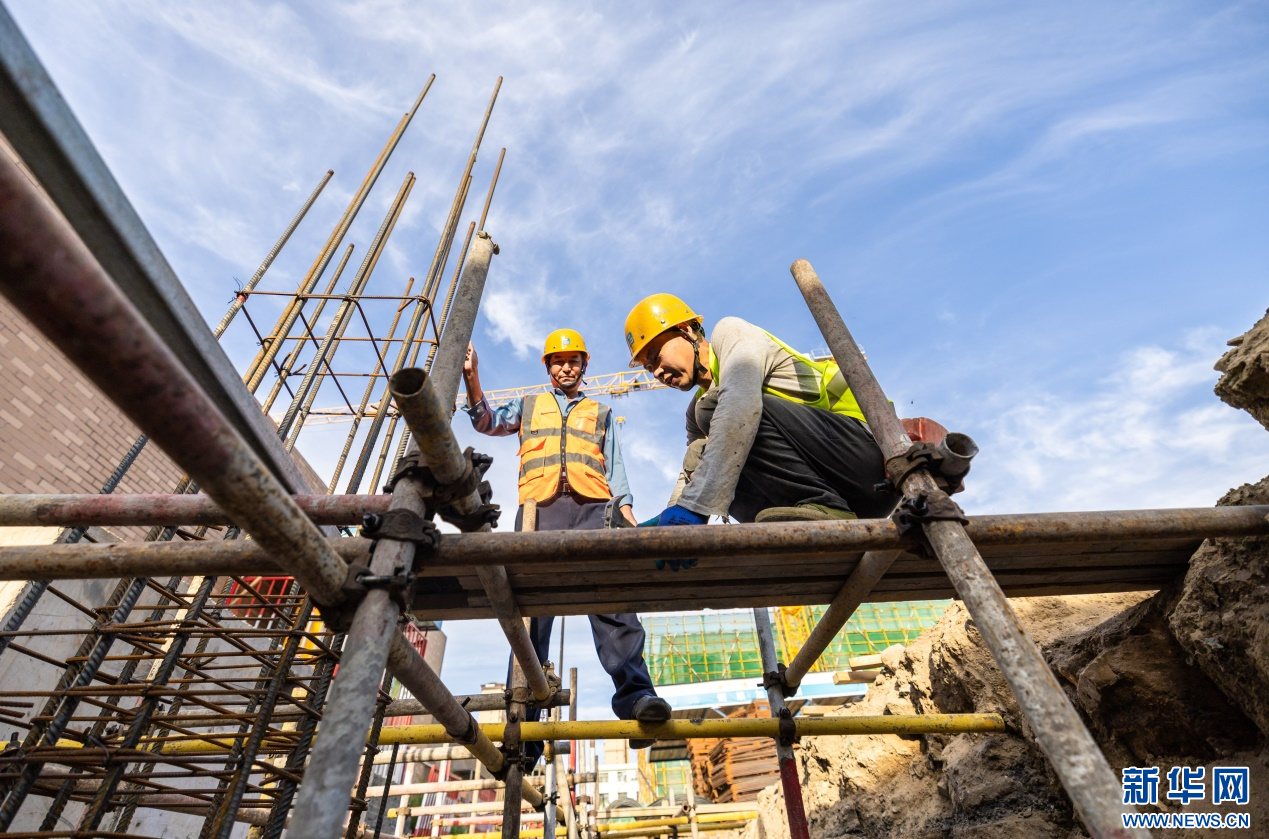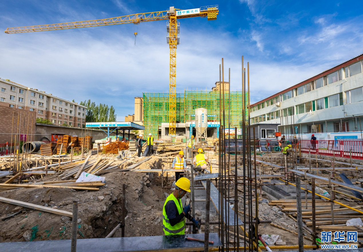 7月10日,工人在呼和浩特市玉泉区水云天幼儿园建设项目现场进行施工作业。新华网发(丁根厚 摄)