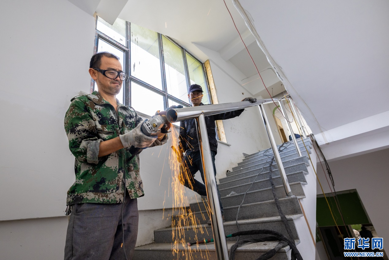 7月10日,工人在呼和浩特市玉泉区云中路幼儿园建设项目现场进行楼道护栏安装施工。新华网发(丁根厚 摄)