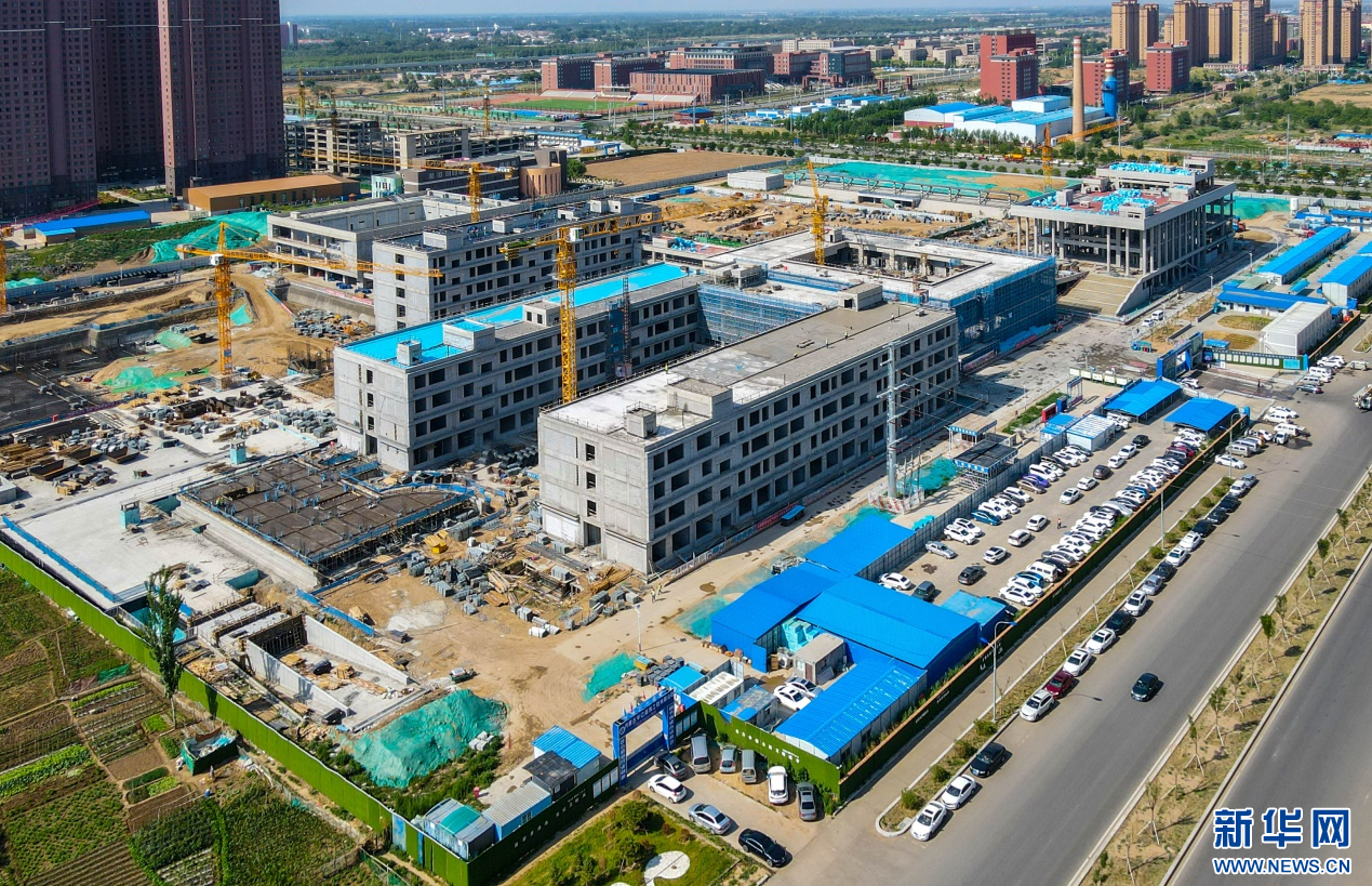 7月10日,工人在呼和浩特市第四中学新址建设项目现场加紧施工。新华网发(于腾蛟 摄)