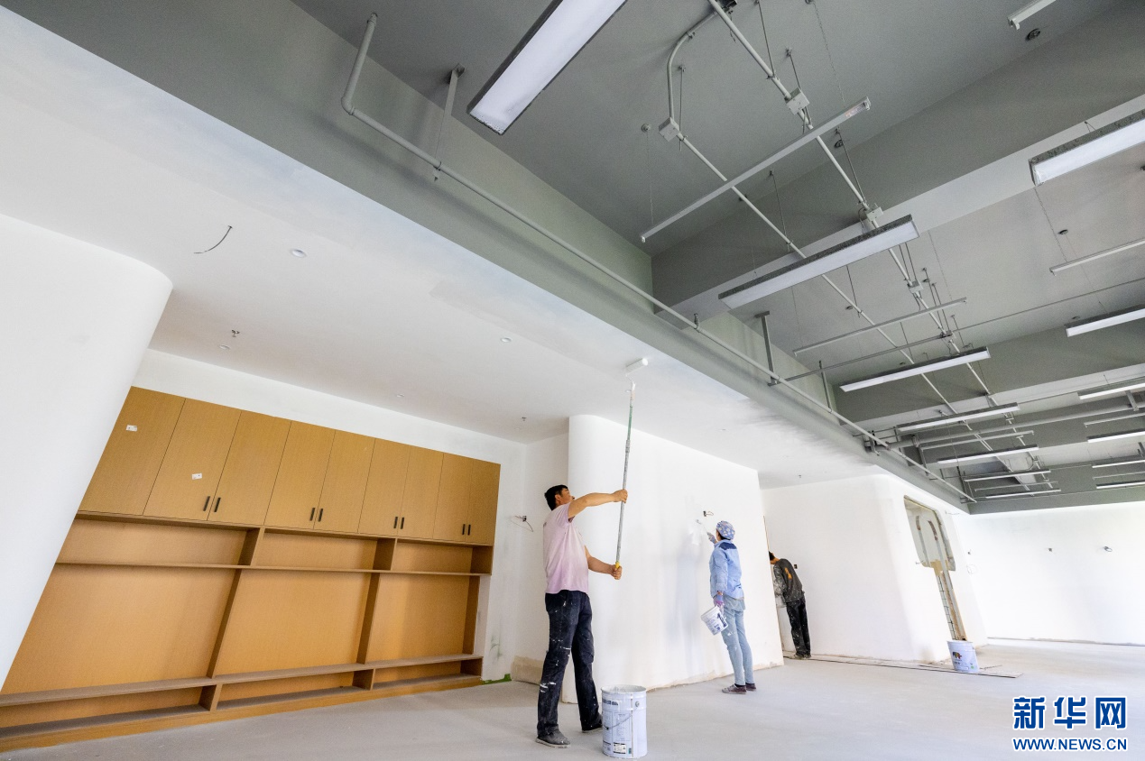 7月10日,工人在呼和浩特市玉泉区云中路幼儿园建设项目现场进行室内施工作业。新华网发(丁根厚 摄)