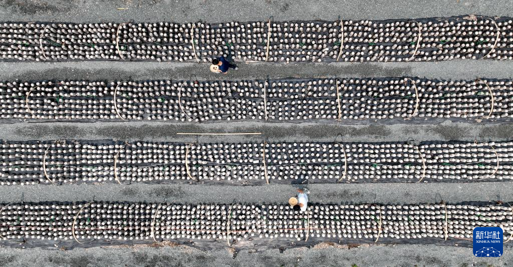 7月11日,在内蒙古扎兰屯市扎兰屯黑木耳产业孵化园区内,工作人员在采摘黑木耳(无人机照片)。新华社记者 贝赫 摄