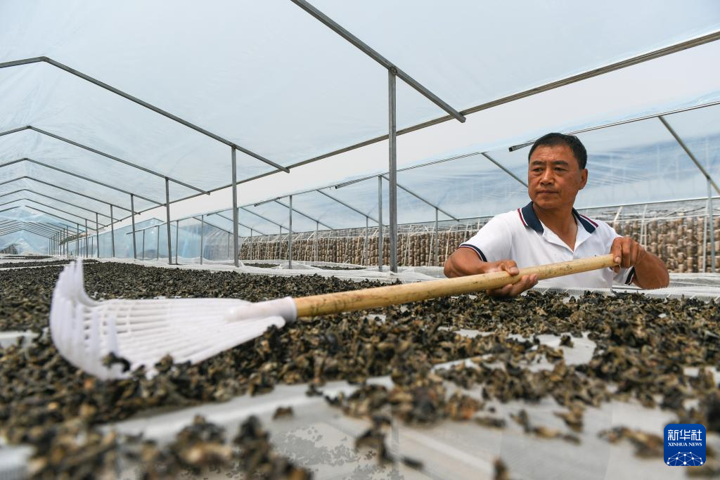 7月11日,在内蒙古扎兰屯市扎兰屯黑木耳产业孵化园区内,工作人员在晾晒黑木耳。新华社记者 贝赫 摄