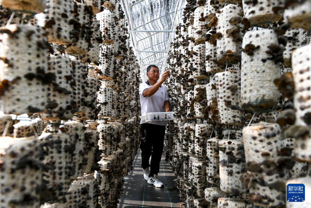 7月11日,在内蒙古扎兰屯市扎兰屯黑木耳产业孵化园区内,工作人员在采摘黑木耳。新华社记者 贝赫 摄