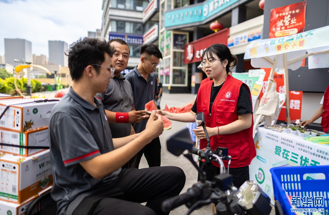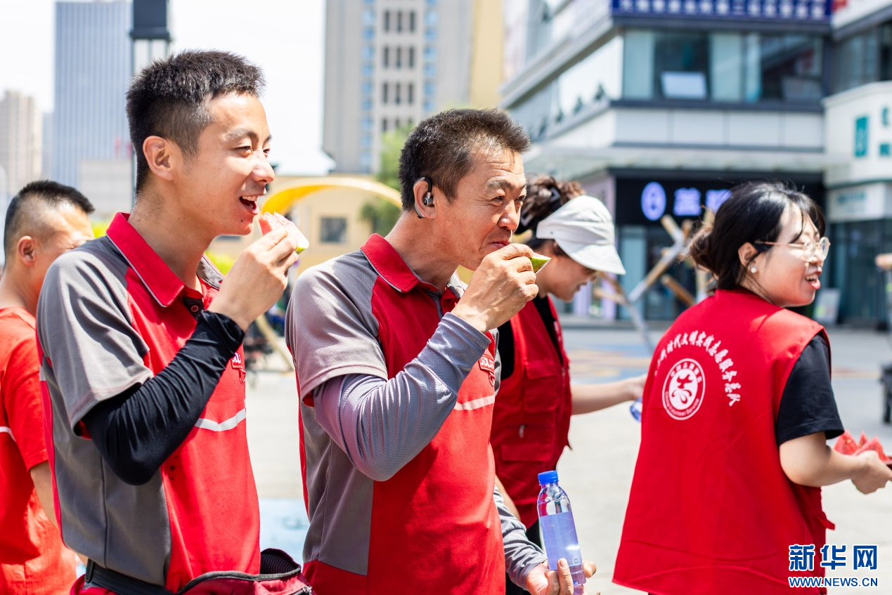 7月28日,呼和浩特市玉泉区民政局的党员志愿者为快递人员送上西瓜解暑。新华网发(丁根厚 摄)