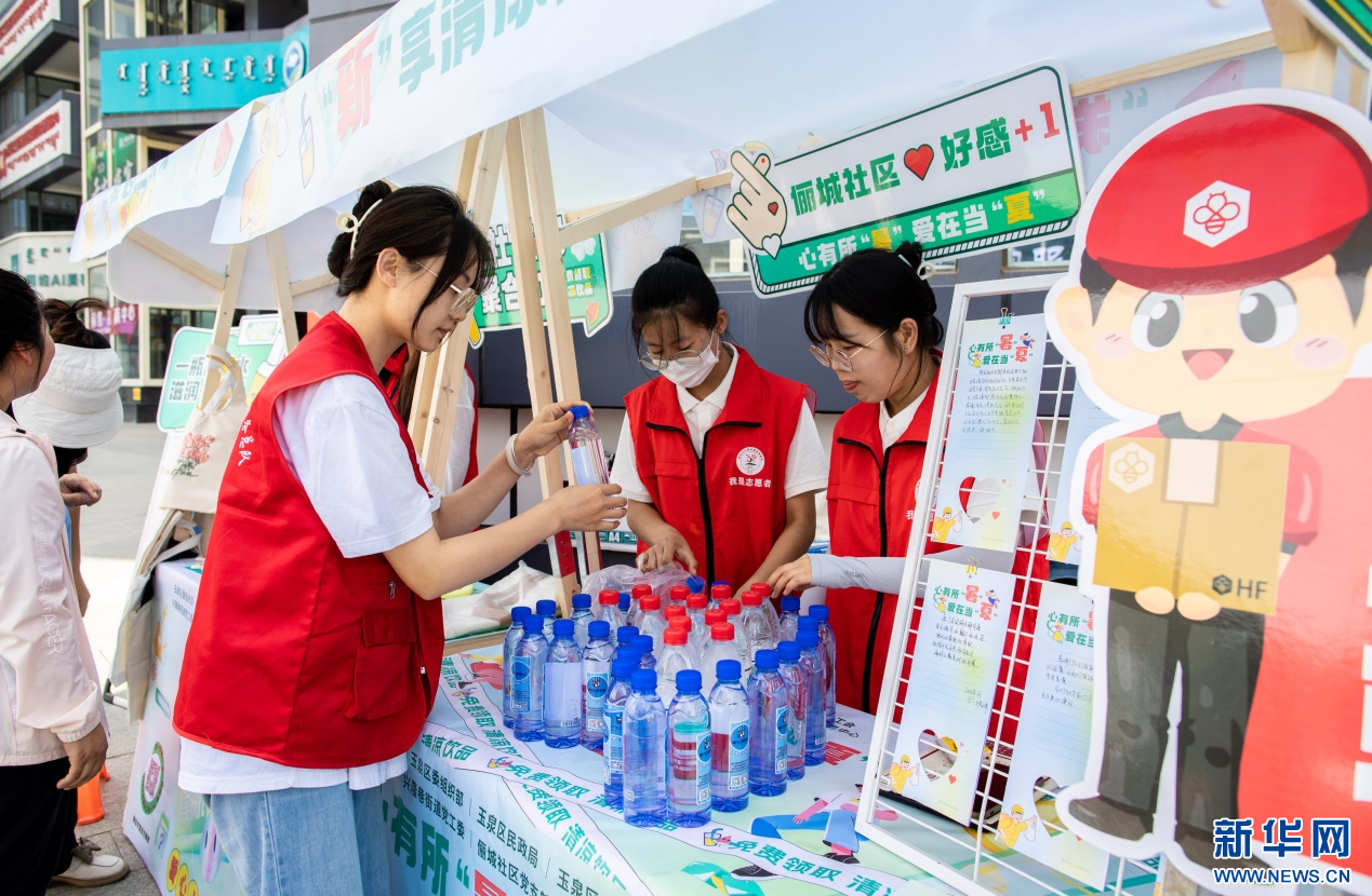 7月28日,呼和浩特市玉泉区俪城社区的党员志愿者在为“红蜂驿站清凉角”添置饮用水。新华网发(丁根厚 摄)