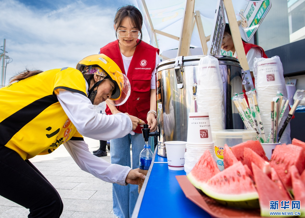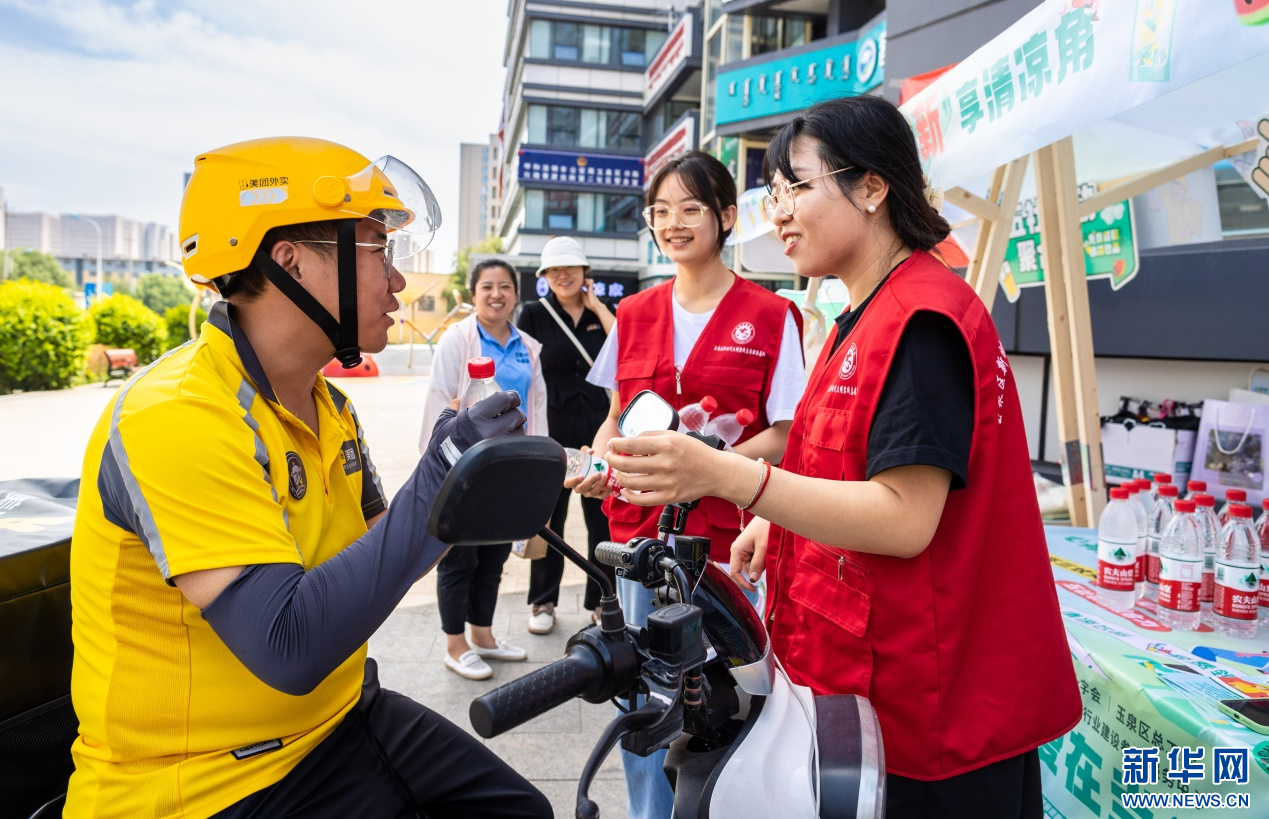 7月28日,呼和浩特市玉泉区民政局的党员志愿者为外卖骑手送上冰镇水。新华网发(丁根厚 摄)