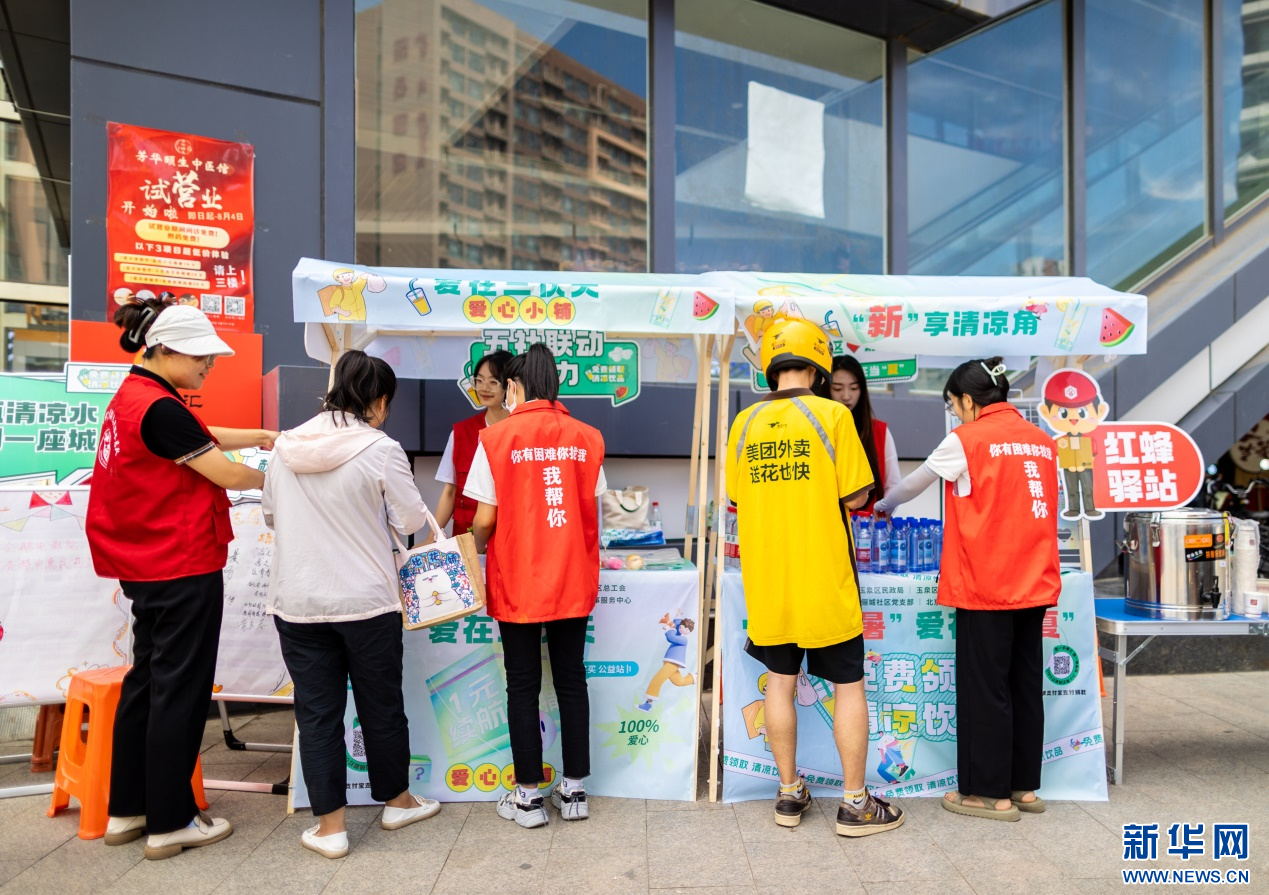 7月28日,外卖骑手在呼和浩特市玉泉区俪城社区“红蜂驿站清凉角”取用绿豆汤解暑。新华网发(丁根厚 摄)