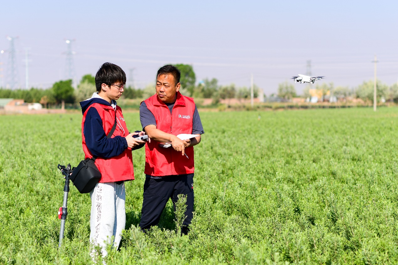 5月27日,内蒙古鄂托克前旗乡村振兴专家人才工作站科技人员在柠条苗地里使用无人机查看柠条苗生长情况。新华网发(王正 摄)